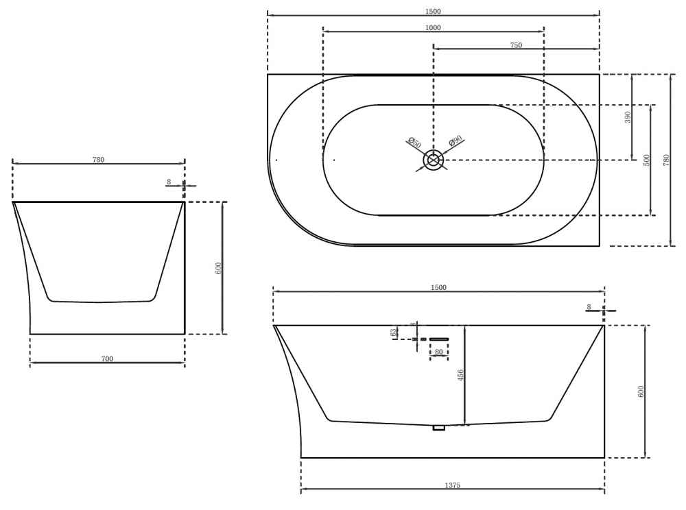 Ванна пристенная 150х78, белый, Abber AB9258-1.5 R